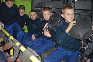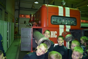 Самое интересное ребят ждало впереди: это гараж и пожарная техника. Сергей Солод рассказал про устройство пожарной автоцистерны, показал ребятам пожарную насосную станцию, пожарный автомобиль связи и освещения и автомобиль газодымозащитной службы. Кадеты попробовали одеть на себя дыхательные аппараты со сжатым воздухом, боевую одежду пожарных. Чтобы заслужить право примерить обмундирование огнеборцев, ребятам нужно было подтянуться на турнике. Они с радостью справились с этим заданием.