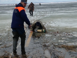 Нельзя проверять прочность льда ударом ноги. Если после первого сильного удара поленом или лыжной палкой покажется хоть немного воды - это означает, что лед тонкий, по нему ходить нельзя. В этом случае следует немедленно отойти по своему же следу к берегу, скользящими шагами, не отрывая ног ото льда и расставив их на ширину плеч, чтобы нагрузка распределялась на большую площадь. Точно так же поступают при предостерегающем потрескивании льда и образовании в нем трещин.
