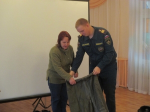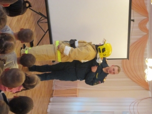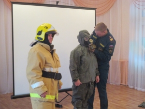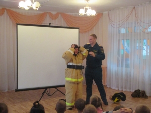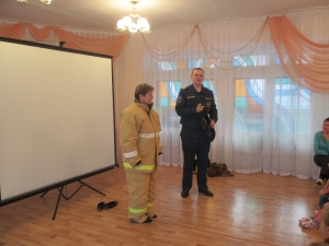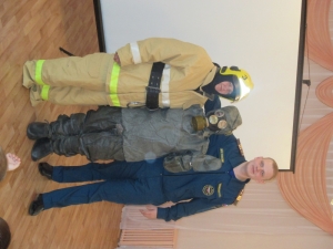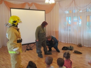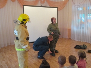 После просмотра познавательных мультфильмов детям были продемонстрированы защитный костюм Л-1 и боевая одежда пожарного.