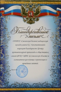 Накануне в знак признательности за тесное сотрудничество и систематическую помощь в организации и проведении занятий директор Смоленского базового медицинского колледжа имени Ксении Семеновны Константиновой Ткаченко Елена Георгиевна передала в Центр противопожарной пропаганды Благодарственное письмо, которое было вручено методистам.