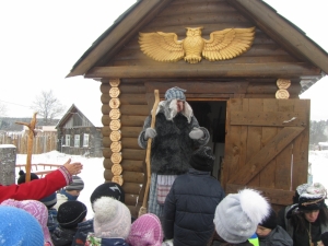 У ворот самой резиденции нас встречал «местный житель» Иван. Он рассказал легенду о главной сказочной героине: «В глухих местах, в лесу, на болоте, у берега речки под названием Яга, жила-была женщина. И была она ведуньей и знахаркой. Знала все лесные тропы, и растения, и зверей, живущих в дремучем лесу. А еще говорили, что своими отварами трав и грибов она могла излечить человека или отобрать у него жизнь. Заговорам ее подчинялись не только люди, но и звери, и вся лесная нечисть.