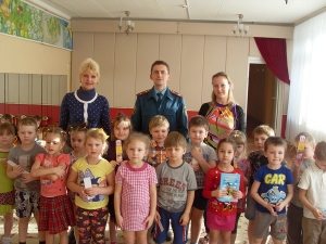 На фото Юрий Ивченков и инструктор ВДПО Анна Шарапкова с детьми в детском саду "Радуга".