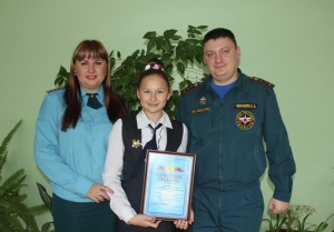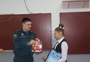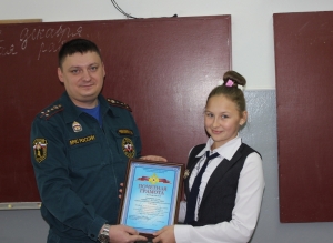 Сотрудники МЧС поздравили школьницу с призовым местом, вручили ей почетную грамоту, подарок и пожелали дальнейших успехов в учебе и творчестве.