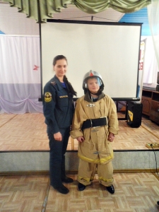 В заключение мероприятия, инспектор ещё раз напомнила учащимся о телефонах пожарной охраны, об алгоритме действий во время пожара и поздравила с наступающим праздником. Приятным завершающим акцентом стала демонстрация и примерка боевого костюма пожарного, который примерили все желающие.
