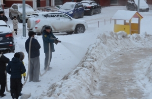 Пятничным вечером более сорока человек вышли для постройки сооружения. Шаг за шагом, лопата за лопатой – и на глазах выросла большая ледяная горка. Да и сами ребята оказали большую помощь родителям. А затем во двор прибыла настоящая пожарная цистерна, и пожарные-спасатели залили горку водой.