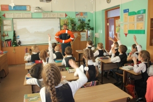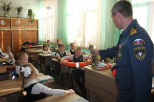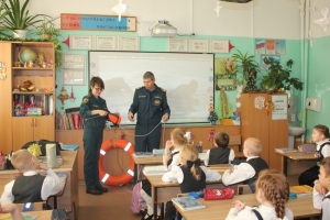 На практической части своей лекции инспектор ГИМС продемонстрировал ученикам средства спасения. Концом Александрова сотрудник МЧС России «спасал» всех желающих из-за парт, предварительно объяснив, что травмировать человека этим средством спасения невозможно, он специально сделан мягким, но крепким. Потом ребятам разрешили примерить на себя ярко оранжевый спасательный круг, и вот ребята передавали его по кругу, с удовольствием надевая его на себя и на соседа по парте.