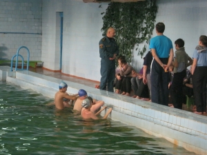 Практические навыки отработали в бассейне. С огромным интересом мальчишки и девчонки наблюдали за действиями инспектора ГИМС. Ребята смогли потренироваться в надевании спасательного жилета, бросании круга и оказании первой доврачебной помощи пострадавшему. Занятие прошло на «отлично». Все смогли закрепить теоретические знания и показать свои навыки.