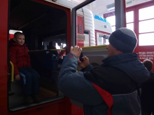 Пожарные автомобили – это, пожалуй, то с чем чаще всего связывают работу огнеборцев. Поэтому гости познакомились с типами и устройствами таких машин. От опытного сотрудника пожарной охраны оин узнали, чем отличаются друг от друга автоцистерна и автолестница, что оснащены они не только устройствами для подачи огнетущащих веществ, но и такими средствами, как спасательный жилет, защитный костюм Л-1, шанцевый инструмент. В гаражном боксе у стеллажа с боевой одеждой огнеборцы показали, как они быстро и ловко надевают свою боевую одежду. Все посетители остались в восторге от увиденного.