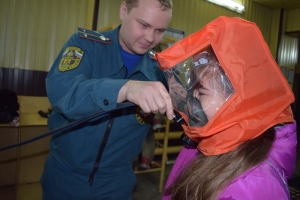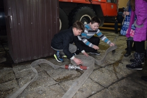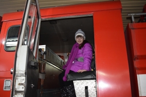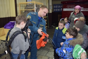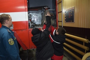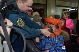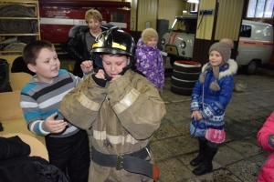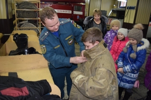 Затем ребят пригласили в гаражные боксы, где школьникам рассказали, что такое пожарный гидрант, какие лестницы используют пожарные в своей работе, какое оборудование лежит в пожарной машине, для чего нужны спасательные веревка и полотно. Некоторым ребятам даже удалось примерить специальное спасательное устройство и подышать воздухом из баллона.
