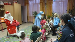 Сотрудники МЧС и Добровольного пожарного общества поучаствовали в новогодних конкурсах веселой Снегурочки, поводили с детьми хороводы вокруг ёлки, а затем подарили воспитанникам сладкие подарки и развивающие игры. Дети в ответ подарили сотрудникам коллекцию своих рисунков на тему пожарной безопасности в быту.