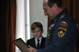 Начальник Главного управления МЧС России по Республике Северная Осетия-Алания Александр Хоружий поздравил лауреата международного конкурса детского рисунка «Спасение на пожаре» 8-летнего Алексея Палешко.