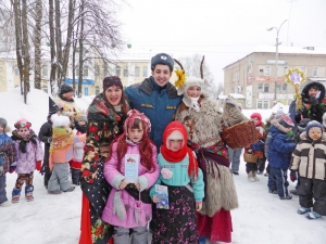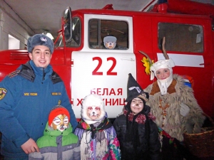На экскурсию в пожарную часть №22 пришла необычная группа посетителей. Ряженые гости водили хороводы и пели «колядки»: