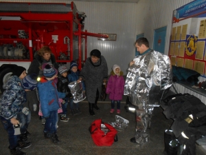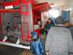 После этого, ребятам продемонстрировали служебные помещения дежурного караула, спецтехнику, пожарно-спасательное оборудование, экипировку пожарных, а также был показан пункт пожарной связи.