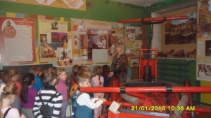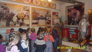 Познавательный рассказ, доброжелательная атмосфера, уютные залы музея – всё это увлекло детей, которые очень внимательно слушали, задавали вопросы и с удовольствием разглядывали экспонаты, представленные в экспозиции. А посмотреть есть на что. Вот бравый пожарный, с лихо закрученными усами, – а ведь, наверное, не каждый знает, что усы и борода служили пожарным для защиты органов дыхания – усы и бороду смачивали, а затем онеборцы устремлялись в задымлённые помещения. А вот конно-бочечный обоз: впереди на коне «скачок» (пожарный – оповещающий прохожих о пожаре) с медной трубой в руках, за ним первая бочка с водой, наполовину пустая, чтобы быстрее добраться до пожара… Словом, много всего, что вызывает неподдельный интерес у ребят. А вот уже сегодняшний день: на смену бочкам с водой пришли пожарные машины, поезда, вертолёты, самолёты – аж дух захватывает! А экскурсия продолжается. И снова вопросы: