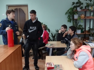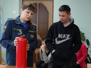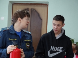 Рассказав о возможных причинах возникновения пожаров в доме, Татьяна Голубева ознакомила ребят с работой огнетушителя, он позволяет максимально быстро справиться с начинающимся возгоранием.