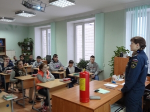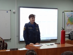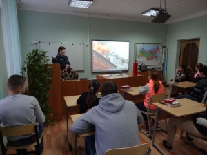 Сегодня в классе собрались ученики седьмого, восьмого и девятого классов. Они уже прекрасно осознают опасность, которую представляет пожар, и поэтому внимали каждому слову сотрудника МЧС. Инспектор группы профилактики пожаров Татьяна Голубева начала свой урок с показа документального фильма о работе пожарных и спасателей МЧС России – 25 лет борьбы с огнём, четверть века – в деле спасения. Ребята, не отрываясь, смотрели на экран, а потом в один голос подытожили: «Пожары…как это страшно. Какие же пожарные молодцы, такие смелые и отважные люди!»