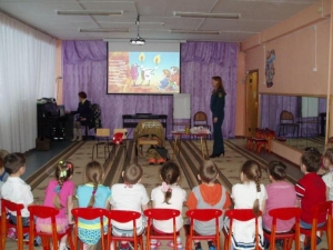 Между показами слайдов с детьми были проведены познавательные игры. Воспитанники детского сада учились находить и объяснять пожароопасные предметы, помогали собраться пожарному на боевой выезд.