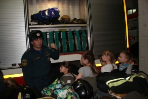 Встретил ребят и их родителей начальник караула капитан внутренней службы Паймеров Константин. Он рассказал экскурсантам о работе пожарной части, показал специальное газодымозащитное оборудование, которое используют огнеборцы для спасения людей в условиях сильного задымления, продемонстрировал боевую одежду пожарного.