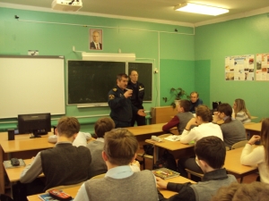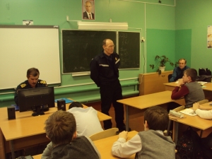 О работе спасателей и водолазов поведал учащимся начальник спасательной станции города Собинки Владимир Мерзлов. Он рассказал об основных действиях в нестандартных ситуациях: как и что делать, если под ногами затрещал лёд, как действовать, если провалился под лёд, озвучил и другие алгоритмы действий, которые помогут ребятам преодолеть панику и спасти свою жизнь.