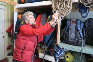 Игорь Жемков и Семён Шилов показали рабочие инструменты, среди них 500–600 метров верёвки, спусковые устройства, верёвочная лебёдка, страховочные петли, связка карабинов.