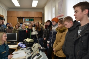 Экскурсию проводил командир отделения 2 караула Гинин Антон и инспектор Анастасия Зуева. Сначала ребят провели на пункт связи части, где они познакомились с работой диспетчера. Здесь их приветствовал диспетчер пожарной части Кашина Людмила. Она рассказала о том, как принимается вызов о пожаре, как подается сигнал тревоги, куда записывается адрес возгорания.