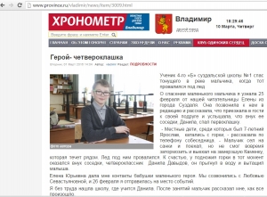 10-го марта в школе №1 города Суздаля на торжественной линейке чествовали настоящего героя, ученика 4-го класса Данилу Давыдова! Он спас своего друга – семилетнего Ярослава Буренкина. Сотрудники 1-го отряда ФПС по Владимирской области выразили Даниле слова благодарности за мужественный и героический поступок и вручили благодарственное письмо.