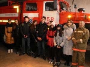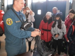 Ребятам показали караульные помещения, дежурно - диспетчерскую службу, помещение для отдыха. Начальник 58 пожарно-спасательной части подполковник внутренней службы Руслан Мусухранов продемонстрировал детям работу специальной видеоконференцсвязи. В гараже боевых машин пожарный Василий Горкун показал ребятам предметы боевой одежды, пожарно-спасательное оборудование и пожарно-техническое вооружение. Даже девчонкам было интересно примерить боевую одежду и дыхательный аппарат.