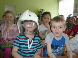 Дети с интересом усваивали новую информацию и принимали активное участие в игре. Во время разминки между двумя командами организаторы провели соревнования по тушению условного пожара. Участники обеих команд очень старались, инструктор вручила приз каждому. В конце занятий детям продемонстрировали раритетные и современные каски пожарных. Примерив обе, ребята оценили качество, удобство и дизайн современных.