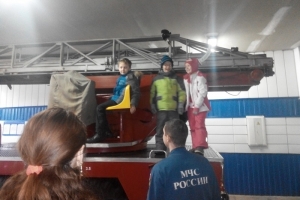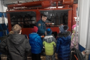 После беседы командир отделения Егор Максимов провёл экскурсию по зданию части. Ребятам показали караульное помещение, пункт связи части, где работают дежурные диспетчеры, учебный класс и спортивный зал, где пожарные учатся и тренируются, чтобы быть всегда в отличной форме. Юным гостям продемонстрировали, как нужно быстро экипироваться в боевую одежду пожарного. Желающие сами смогли примерить одежду огнеборцев. Затем школьники проследовали в пожарное депо, где им показали технику, находящуюся на вооружении пожарной части и пожарно-спасательное оборудование.