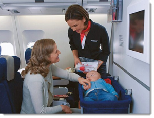 Учтите, что как бы сладко ребенок ни уснул в слинге, скорее всего, вам придется подчиниться непреложному правилу: и при взлете, и при посадке ребенок должен быть пристегнут ремнем на коленях у родителя или на своем месте. Те же правила действуют всякий раз, когда во время полета загорается табло «пристегните ремни».
