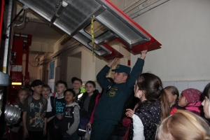 Занятие началось с ознакомительной экскурсии ребят с пожарной частью, в ходе которой Михаил Илявин рассказал мальчишкам и девчонкам о каждом рабочем помещении части. Пожарные показали школьникам свою столовую, комнату отдыха, раздевалку, спортивный уголок.