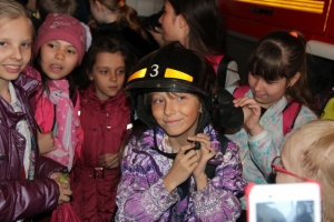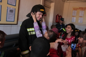 Огнеборцы также предложили ребятам примерить и форму пожарного. На это предложение ребята наперебой бросились примерять каску огнеборца. Все без исключения также примерили боевые перчатки пожарного.