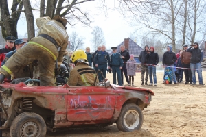 В процессе учений пожарные познакомили присутствующих с историей возникновения пожарной службы, обмундированием и условиями работы пожарных, а дети в свою очередь познакомились с отличительными особенностями пожарной машины.