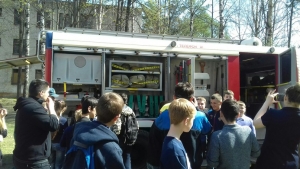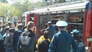 Затем ребята вместе с сотрудниками отдела надзорной деятельности и профилактической работы по городу Твери и пожарно-спасательной части № 2 отправились в школьный двор. Здесь они смогли не только посмотреть пожарно-спасательную технику и инвентарь, но и почувствовать себя в роли настоящего огнеборца, посидев за рулем пожарного автомобиля и примерев «боевку».