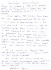 Письма получились очень трогательными. Каждый ребёнок, который написал письмо, размышлял о Великой Отечественной войне, вложил частичку своей души в своё послание. В посланиях ветеранам ощущается гордость за наших отцов, дедов и прадедов – ветеранов и тружеников тыла Великой Отечественной войны. Благодаря их отваге, стойкости и самоотверженному труду мы уже более семи десятилетий живём в мирной и свободной стране, учимся, работаем, служим, растим детей и радуемся жизни. И важно то, что подрастающее поколение знает и помнит о беспримерном всенародном подвиге в годы той страшной войны.