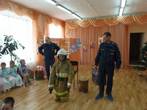 В детский сад «Золотая рыбка» г.Режа пришли заместитель начальника 223 пожарно–спасательной части Денис Крякунов, инструктор по пожарной профилактике Елена Якимова и мастер базы газодымозащитной службы Александр Балуев. Сотрудники МЧС в первую очередь рассказали детям о действиях в экстремальных ситуациях при пожаре, как предотвратить их, и показали боевую одежду пожарного.