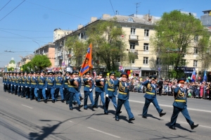 Перед ветеранами и жителями города торжественным маршем прошли части и подразделения Рязанского территориального гарнизона, курсанты, сотрудники федеральных структур и ведомств, учащиеся кадетских классов, в том числе ученики профильного класса «Юный спасатель» средней школы №47 и студенты Рязанского колледжа имени Героя Советского Союза Н.Н.Комарова.