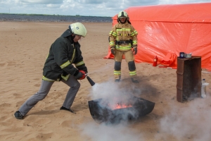 «Фестиваль безопасности» предлагал занятия людям всех возрастов, от самых маленьких до подростков и взрослых. В «мастерской пожарно-спасательных наук» собрались дошколята, которым предстояло проползти сквозь туннели, потушить пожар из ствола и вынести на носилках спасенных кукол. Ребятам постарше и взрослым - задание на порядок сложнее. На песке - противень с горящим машинным маслом, которое нужно затушить с помощью огнетушителя. Возрастной ценз участников – от 14 лет. Выдернуть чеку, направить раструб на пламя, нажать на рычаг – эту нехитрую последовательность действий может выполнить каждый, главное – крепко держать баллон.