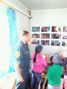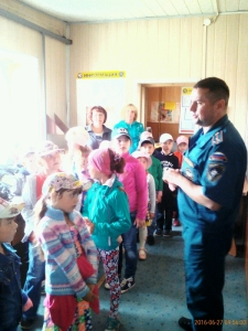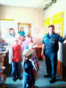 Начальник части Забаев Роман Александрович провел школьников в дежурное помещение, где принимают звонки по различным происшествиям диспетчера. Дети увидели учебный класс, где проходит служебная подготовка пожарных и комнату отдыха дежурного караула. Далее все вместе побеседовали на тему: «Нельзя играть с огнем!» и «Безопасное поведения на водных объектах!".