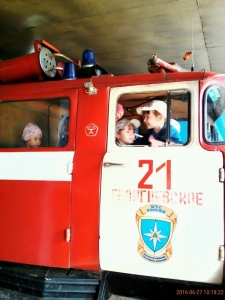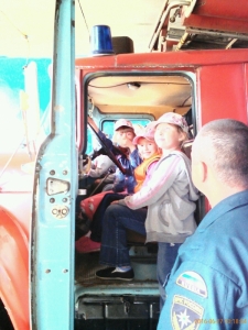 В заключении встречи водитель пожарного автомобиля Пивицин Андрей Сергеевич показал ребятам пожарные автомобили и их пожарно - техническое вооружение. Желающие посидели в кабине автомашины. Экскурсия по части детям понравилась.