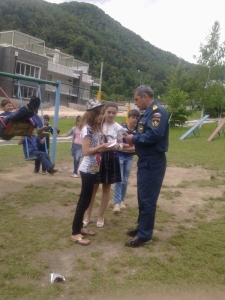 В рамках проводимого месячника безопасности и надзорно-профилактической операции «Пляж 2016» государственные инспектора отдела безопасности людей на водных объектах Главного управления МЧС России по Республике Ингушетия, совместно со спасателями республики периодически проводят инструктажи и разъяснительные беседы с воспитателями детских оздоровительных лагерей и детишками отдыхающими вблизи водоемов. Сегодня специалисты МЧС Ингушетии побывали в лагере «Эрзи», который находится в Джейрахской районе. В ходе визита специалисты МЧС провели индивидуальные беседы с воспитателя и детишками. Особое внимание сконцентрировано на организацию летнего отдыха детей, включая обучение их плаванию и оздоровительное купание.