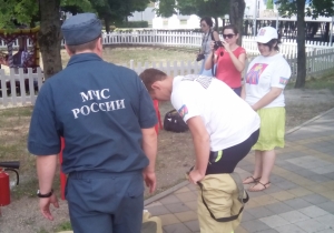 Одной из остановок стала «Пожарная охрана». Здесь юные смельчаки примеряли комплект боевой одежды на время. Также огнеборцы рассказали ребятам от чего конкретно защищает тот или иной элемент спецобмундирования, научили пользоваться огнетушителем.