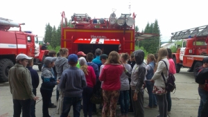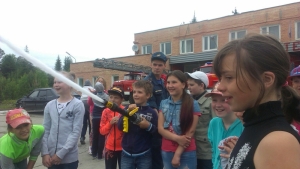 Так же дети из лагерей приходят в гости в пожарную часть на день открытых дверей, где им рассказывают об устройстве пожарных автомобилей, и даже дают попробовать подать воду из рукава.