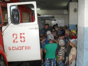 Ученики 4-7 классов, отдыхающие в пришкольном летнем лагере Базарносызганской средней школы №1, посетили пожарную часть №25, чтобы изнутри увидеть работу тех, кто каждый день спасает жизни людей. Детям стало известно, что 2016 год объявлен Годом пожарной охраны России. Школьники с интересом выслушали историю этой важнейшей службы.