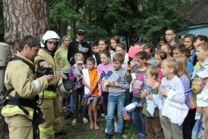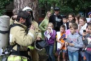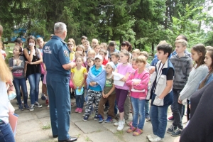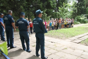 На территории детского лагеря высадился настоящий «десант МЧС». Инспекторы надзорной деятельности, пожарные, специалисты ГИМС и Управления по делам ГО и ЧС провели масштабное занятие, направленное на безопасный отдых детей в летний период. Началось всё с экстренной эвакуации воспитанников лагеря из здания жилого корпуса. По сигналу звукового оповещения о пожаре вожатые организовано, без паники выводят ребят на улицу, используя при этом все три эвакуационных выхода. Сразу после построения и доклада вожатых о количестве эвакуированных детей инспектор надзорной деятельности проводит беседу и мини-викторину с детьми по правилам пожарной безопасности.