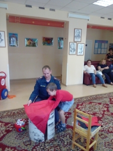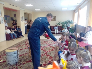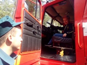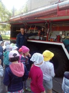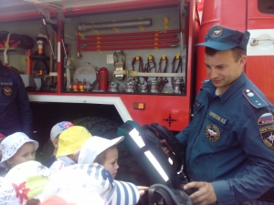 В конце мероприятия ребята познакомились с пожарным автомобилем, обмундированием и оборудованием пожарного, сотрудники МЧС показали им средства, используемые в тушении пожаров и проведении аварийно-спасательных работ.