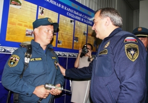 Дежурный караул одной из пожарно-спасательных частей Федеральной противопожарной службы по Республике Бурятия встретил Главу МЧС России на боевом посту. Внимание высокого гостя сразу привлекли изобретения бойцов – устройство для сматывания пожарных рукавов и приспособление для легкого вскрытия конструкций из металлопрофиля.