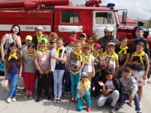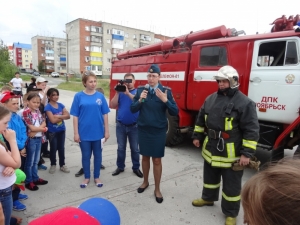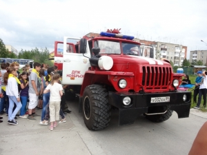 И, в подтверждение четверостишья, инспектор рассказала о специфике работы пожарного, защитных свойствах боевой одежды. А вот какое вооружение применяют пожарные при работе на пожарах или при проведении аварийно-спасательных работах ребята и педагоги смогли увидеть в открытых отсеках машины. Не обошлось без вопросов, которых традиционно было очень много. Далее бравый пожарный пригласил всех желающих посидеть в пожарной машине, а желающих было так много, что некоторые по три раза побывали в кабине. Но программа подходила к финалу, и пришло время прощаться. В заключении ведущая и Спичка выразили надежду, что впредь дети будут играть только в безопасные игры, а инспектор пожарной охраны пожелала всем безопасных летних каникул.