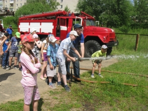 Мероприятие состояло из конкурсов, показа сценок на противопожарную тематику, беседы по соблюдению мер безопасности. Помимо этого, огнеборцы устроили для ребят настоящие испытания: скоростное надевание боевой одежды, тушение условного пожара ручным стволом.