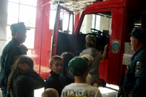 Проведена веселая викторина на пожарную тематику. Показана пожарная техника, пожарно – техническое вооружение. Ребята примерили боевую одежду пожарных, посидели в кабине пожарного автомобиля.